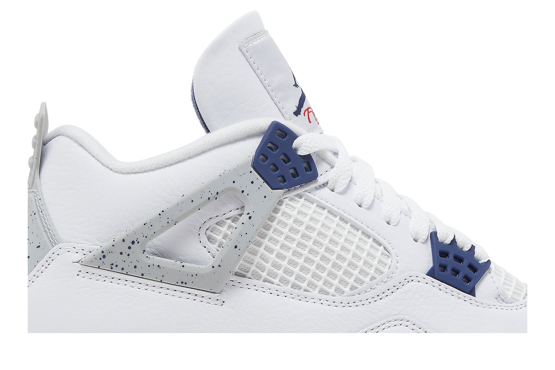 La Air Jordan 4 Retro 'Midnight Navy' habille la silhouette légendaire dans le même jeu de couleurs utilisé pour la coloration originale 'Fire Red'. Le haut est composé de cuir blanc avec des ailes de soutien noires, une bande d'arrière noire avec une marque Jumpman émaillée et des œillets en moulage bleu nuit. Une deuxième icône Jumpman orne la bandoulière tissée de langue en cramoisi. Le sneaker est monté sur un midsole polyuréthane à deux tons, avec une unité d'air encapsulée dans le forefront et une unité visible à l'arrière.